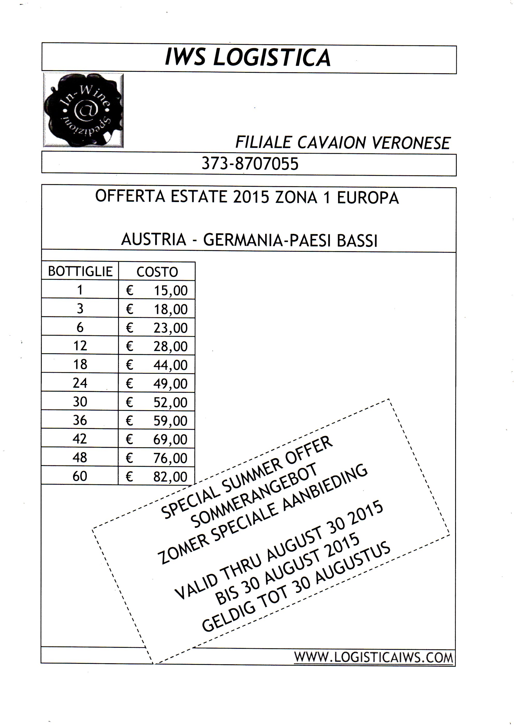 Transportkosten für Weinliferung nach Deutschland, Österreich und Holland bis 31/8/2015!